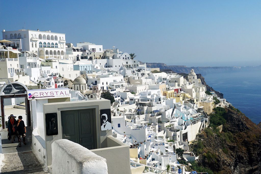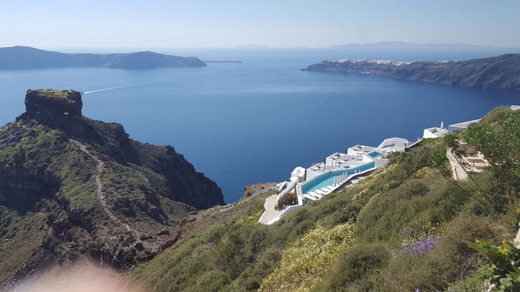 We will take you to a tour that includes all main villages located on the top of the slope and overlooking the Caldera: Firostefani, Imerovigli and Oia. We begin our day from the main square in Firà and take the road towards the north and to the square of Firostefani, extension of Firà. It’s a village that rises along the edge of the slope, with restaurants, hotels and a charming church, Saint Gerasimus, framed by tall cypress trees, which is rather rare in the island.